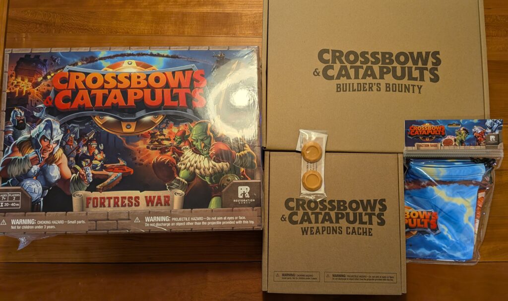 Second is a Crossbows & Catapults full set donated from Restoration Games. A reboot from the game from the 1980s, this prize package contains everything available in the Crossbows & Catapults line. The Fortress War big box set, a second set of castle building blocks, additional weapons, additional ammo, and bags to store the blocks in. A big thank you to Restoration Games for donating this full set!
