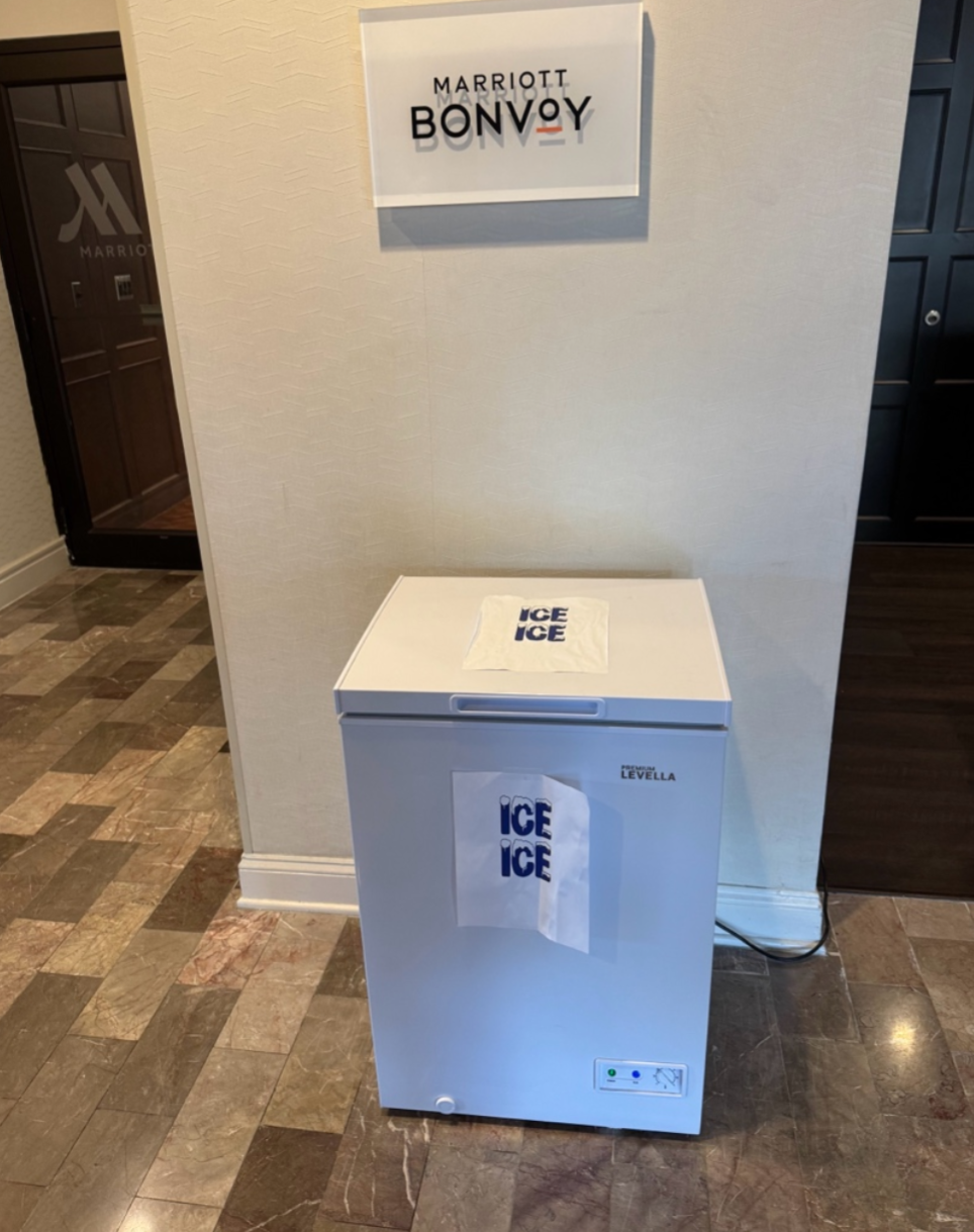 First, due to ongoing hotel renovations, the ice machines are not currently working. The hotel is proving bags of ice from the cooler located between the hotel main entrance and the lobby front desk. Please see photo of the freezer: